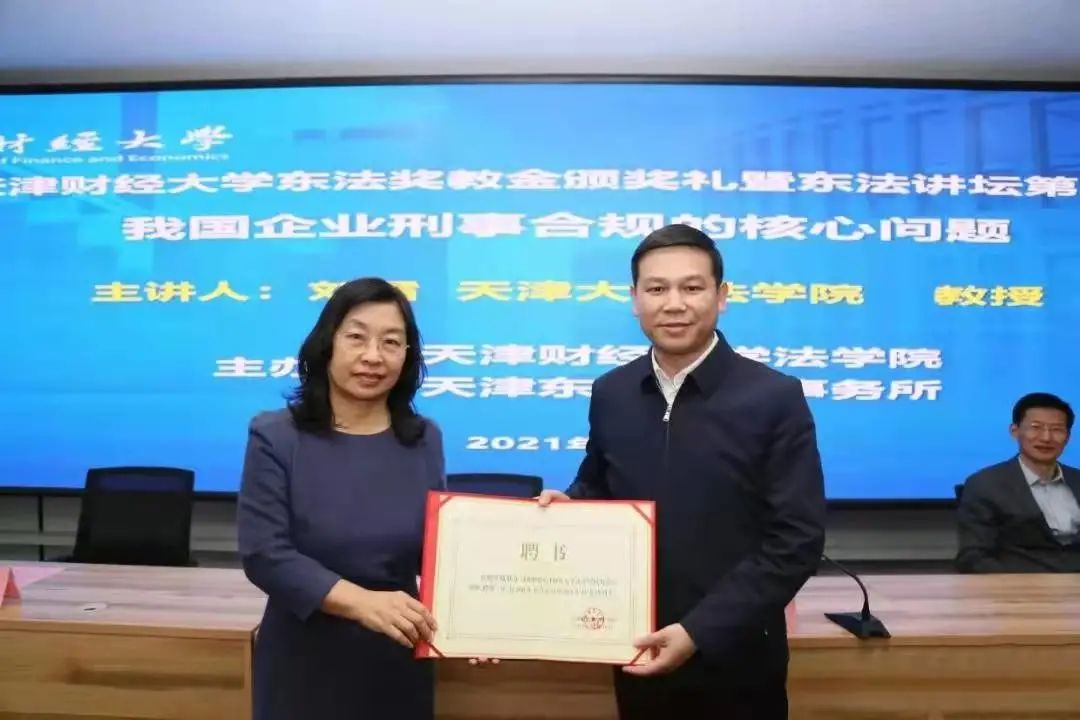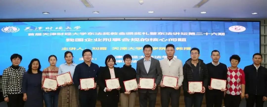 2021年12月16日下午,首届天津财经大学“东法奖教金”颁奖礼在A座403会议室隆重举行。天津东法律师事务所陈亚东主任,我校教育发展基金会汪静媛秘书长,法学院领导和获奖教师代表以及本科生和研究生代表共40余人参加了颁奖礼及讲坛活动。仪式由樊纪伟副院长主持。
